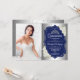 Quinceanera party invitation with your photo. Features script font, white roses, tiara and confetti. Classy navy white design with faux glitter silver. Perfect for an elegant celebration.