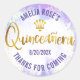 Be proud, rejoice and showcase your daughter’s milestone Quinceañera! Use this stunning, modern sticker to add to her special day. Sparkly gold faux foil calligraphy script and tiny confetti glitter dots, along with purple sans serif typography, overlay a soft purple watercolor background. Personalise the custom text with her name and date of event. Choose from a round or square shape. Guaranteed to add stylish fun to all her correspondence as well as goody bags. Matching and coordinating invites, address labels, thank you cards and other Quinceañera supplies are also available in this trendy and special collection.