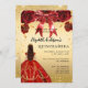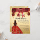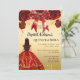 A modern, stylish and glamourous invitation for a Quinceañera, 15th birthday party. A faux gold background with faux gold glitter, a girl wearing a red and gold dress and red roses, florals and a bow. The name is written with a modern hand lettered style script. Personalise and add your party details.