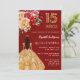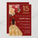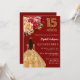 A modern, stylish and glamourous invitation for a Quinceañera, 15th birthday party. A red background, a girl wearing a golden dress and red, pink and golden roses, florals. The name is written with a modern hand lettered style script. Personalise and add your party details.