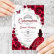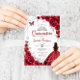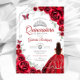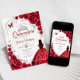 Red, silver and white Quinceanera celebration invitation. Features, brunette girl in ball gown dress script font, butterflies, watercolor roses and tiara. Perfect for an elegant princess style glam celebration. Personalise with your own details. Printed Zazzle invitations or instant download digital printable template.