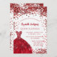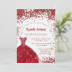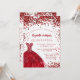 A modern, stylish and glamourous invitation for a Quinceañera, 15th birthday party. A white background with confetti, a red dress. The name is written with a modern hand lettered style script. Personalise and add your party details.