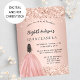 A modern, stylish and glamourous invitation for a Quinceañera, 15th birthday party. A rose gold background with faux sparkles, a girl wearing a ball gown. The name is written with a modern hand lettered style script. Personalise and add your party details.
