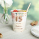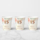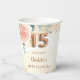 For an elegant Quinceañera, 15th birthday party. A white and golden watercolorded background. On the front and the back: Personalise and add a name and a date. Decorated watercolored rose gold and blush pink florals, eucalyptus greenery and faux glitter dust. Nr 15 is written with a balloon style font.