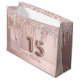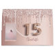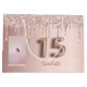 A gift bag for a girly and glamourous Quinceañera, 15th birthday. A rose gold background with rose gold and pink glitter drips, paint dripping look. Personalise and add a photo and a name. Number 15 is written with a balloon style font. Perfect as a party favour bag or as a gift bag.