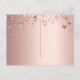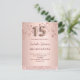A modern, stylish and glamourous invitation for a Quinceañera, 15th birthday party. A faux rose gold metallic looking background with an elegant faux rose gold glitter drip, paint drip look. The name is written with a modern dark rose gold coloured hand lettered style script. Personalise and add your party details. Number 15 is written with a balloon style font, script.