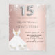 A modern, stylish and glamourous invitation for a Quinceañera, 15th birthday party. A rose gold background with faux silver glitter dust and a dress. The name is written with a modern hand lettered style script. Number 15 is written with a balloon style fon. Personalise and add your party details.