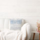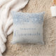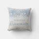 A pillow for a Quinceañera, 15th years old girls room. A faux silver metallic looking background with blue faux glitter drops, spots. The text: Quinceañera is written in blue with a large modern hand lettered style script. Personalise and add a name.
