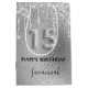 Elegant, classic, glamourous and girly for a Quinceañera, 15th birthday party. A faux silver metallic background. Decorated with faux glitter drips, paint dripping look. Personalise and add a name. With the text: Happy Birthday. The name is written with a modern hand lettered style script. Number 15 is written with a balloon style font.