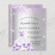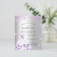 A modern, stylish and glamourous invitation for a Quinceañera, 15th birthday party. A faux silver metallic looking background with purple faux glitter dust and a dress. The name is written with a modern hand lettered style script. Personalise and add your party details.