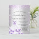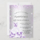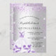 A modern, stylish and glamourous invitation for a Quinceañera, 15th birthday party. A faux silver looking background with purple faux glitter dust and a dress. The name is written with a modern hand lettered style script. Personalise and add your party details.
