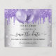 A faux silver looking background decorated with violet, lavender coloured faux glitter and balloons. Personalise and add a date and name/age. The text: Save the Date is written with a large trendy hand lettered style script.