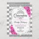 Features stripes, script font, pastel pink roses, tiara and confetti. Classy blush pink design with faux glitter silver. Perfect for an elegant glam celebration.