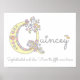 Pretty Q initial / monogram art name poster perfect for a girls bedroom or playroom in shades of grey, white, yellow, pink and purple. Personalise with your child's own name beginning with Q, and name meaning for a truly personalised touch to your child's bedroom or nursery, this example is for the name Quincey Sophisticated and chic. From the fifth son's home. Cute poster print ideal for a new baby, christening or baby shower gift. © Unique Q monogram hearts and flowers drawing description and graphic art design by Sarah Trett. www.sarahtrett.com for www.mylittleeden.com