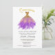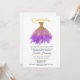 A gold glitter purple Quineanera party invitation watercolor party gown with lace pattern on dress. The soft pink gradient is carried over to the back of the invitation. Personalise with her name in this script signature contrasted with sturdy classic Goudy text typography.
