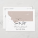This travel themed save the date postcard features a blush Montana map and postcard backing. Easily change the colours and move the heart around to highlight your destination. Edit *most* wording to match your needs and easily add a special message to the backside of the invitation.
