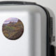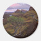 Round photo magnet of a tree in front of the mountains of the Quiraing landscape with pink colours in the sky at sunrise at Trotternish Ridge on the Isle of Skye in Scotland, UK.