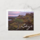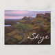 Postcard of a tree in front of the mountains of the Quiraing landscape with pink colours in the sky at sunrise at Trotternish Ridge on the Isle of Skye in Scotland, UK with the text 'Skye'.