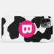 Quirky cool black and white cow spots pattern with bold hot pink monogram.