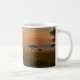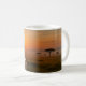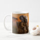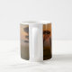 A white ceramic mug with a unique and funny image of an elephant wearing a suit, sitting calmly in an antique chair during an African sunset.