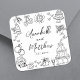 Personalised Hand-Drawn Quirky Wedding Stickers. These fun and playful square wedding stickers feature quirky doodle illustrations surrounding the design, including a champagne tower, wedding cake, disco ball, hearts, wedding bells, rings, cameras, and more. The bride and groom's names and wedding date are elegantly displayed beneath this whimsical artwork in a mix of handwritten script and simple fonts, offering a unique yet stylish look.