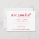 This adorably quirky wedding RSVP features a minimalist typography composition with sassy, modern wording. A perfect design for a couple who loves to show their humourous side! Add your custom wording to this design by using the "Edit this design template" boxes on the right hand side of the item, or click the blue "Customise it" button to arrange the text, change the fonts and colours and to also add additional information or images to this design. If you need any coordinating items, (thank you cards, etc.) please contact me for a custom order.