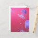 Artistic photograph of purple jellyfish floating in luminous pink water.