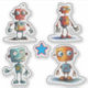 Set of 4 vinyl stickers, quirky robot designs # 1 - 4. Perfect for party favours, stocking stuffers, classroom prizes, or scrapbooking. Can be cut into 4 individual stickers, as desired.