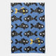 A fun and modern seamless block print style fish pattern featuring rows of black fishes on a deep blue background with occasional pops of yellow tails. Ideal tea towel gift for lovers of marine life! Available in other colors