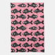 A fun and modern seamless block print style fish pattern featuring rows of black fishes on a soft pink background with occasional pops of pink tails. Ideal tea towel gift for lovers of marine life! Small scale. Available in other colors