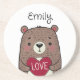 Add a personal touch with this adorable drawing of a whimsical brown bear holding a red love heart, featuring the word 'Love' in white text. Perfect for gifting, the bear design brings a cute and quirky charm to any occasion. Above the bear, a stylish black script template allows you to easily personalise with your name, making it a unique and thoughtful gift.