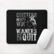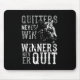 Mousepad features "Winners Never Quit, Quitters Never Win" inspiring quote paired with tiger image (profile). The design is in black, white, and grey and uses distressed bold font.
