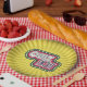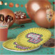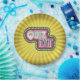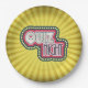 Quiz night trivia party paper plates. With big bold typography surrounded by dressing room lights. The background is a yellow sunburst pattern.