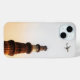 The image displays an iPhone case featuring a graphic of the Qutub Minar, a historic minaret in Delhi, India, under a sky with an aeroplane flying overhead. The Qutub Minar is depicted in a brownish-red hue, showcasing its intricate architectural details, while the aeroplane is a small, silhouetted figure against the light sky. The overall appearance is that of a protective case for an iPhone, with the featured image printed on its back.