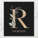 Letter R monogram floral. Letter R in golden brown texture accented with green watercolor compound leaves, flower blossoms and gold dust. Personalised with name in matching font.