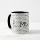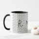 CELEBRATE MARCEL DUCHAMP'S PIECE FOUNTAIN. HE USED THE ALIAS R. MUTT WHEN HE SUBMITTED A URINAL TO THE SOCIETY OF INDEPENDENT ARTISTS ART SHOW IN 1917. HIS READYMADE CAUSED AN UPROAR. TO REMEMBER THIS THE MUGS SAYS R. MUTT. UPSIDE DOWN IN THE BACKGROUND HAS MARCEL DUCHAMP'S NAME REPEATED OVER AN OVER