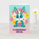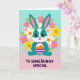 Designed with a sweet, stylised rabbit at the centre, this card features a teal body with a white blaze on the face and a white belly, giving it a gentle, friendly look 🐰. The rabbit’s big eyes, tiny heart-shaped nose, and rosy cheeks suggest a tender, affectionate mood, as if it’s shyly offering a gift to someone special. Long ears with pink inner details stand upright, adding to the attentive pose. In its paws, it holds a small basket with purple-and-white stripes, filled with smooth orange egg shapes that feel like a shared springtime find 🐇. A ring of flowers frames the character, mixing pastel pink, sunny yellow, and soft white petals with orange centres, threaded with light green leaves. Behind everything, the background fades in a vertical gradient from aqua at the top to blush pink near the bottom, keeping the scene airy and soft. Near the lower portion, friendly purple text is placed prominently, standing out clearly against the lighter backdrop. The floral wreath circles the rabbit evenly, with blossoms and leaves spaced all around like a gentle halo.
