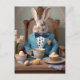 Rabbit in a blue coat having afternoon tea