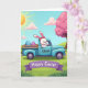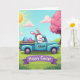 Designed with a spring scene in mind, this card features an upright white rabbit with long ears and a small red bow, smiling as it drives an old-fashioned aqua pickup truck 🐰. The rabbit’s bright eyes and gentle grin suggest it’s on a sweet delivery for someone special, like a friend it can’t wait to see. On the truck door, a short hand-lettered note in dark ink sits neatly along the side, hinting at a seasonal delivery without stealing focus. In the wooden truck bed rest two oversized decorative eggs, one calm blue with wavy lines and one purple with tidy horizontal stripes, arranged like a thoughtful gift. Above, an azure sky holds soft pink-tinted clouds while a golden sun glows from the upper left, warming the scene. A wide green lawn spreads across the bottom, and a purple banner near the lower edge carries a seasonal greeting in light-colored letters, with a small 🌷 nearby. To the right, a sturdy tree is covered in bright pink blossoms, its clustered flowers framing the truck as it rolls by.