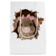 is peeking out from a crack in a white wall.