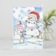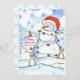A cheerful Holiday Open House invitation card for Christmas decorated with a happy snowman in a Santa cap with his three white rabbit friends in the snow illustrated with marker and watercolor.