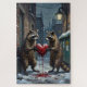 This humorous film noir style illustration captures two masked Raccoons sharing a romantically pilfered, heart-shaped piece of red velvet cake in a dim, snowy alleyway. A quirky, moody, and funny Valentine's Day design.