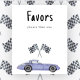 Race car theme baby shower invitation card featuring watercolor illustrations of a purple (violet) vintage car and black - white race flag. "Race on over for a baby shower."
