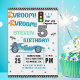 Rev up the excitement with this editable Race Car Birthday Invitation! Featuring the fun phrase “Vroom… Vrooom Start Your Engines For”, bold tire tracks, and a cool racing car in black, blue, and green, this invitation is perfect for boys ages 2 to 10. Easily customize the child’s name, age, date, time, and party details. Ideal for racing lovers and high-speed birthday themes!