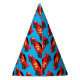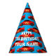 Race car theme kid's Birthday party paper cone hats. Cute pattern with automotive design. Blue or custom background colour. Personalise with text optionally. Change the quantity the get the cheap bulk price. Cool red toy race car pattern.