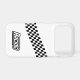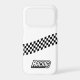 This iPhone case is shown with a black and white checkered racing print.