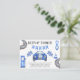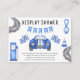Race car theme baby shower invitation card featuring watercolor illustrations of a blue race car. "Race on over for a baby shower."