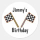 Fun birthday party sticker or envelope seal done in white with black custom text. Graphics of two crossed chequered flags decorate the middle. Personalise the text for your son's special day. Great with our little boys Race Car Birthday Invitations.
