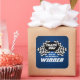 Black and white racing flags sticker with a blue background. Thank you favour sticker for your racing themed birthday party.