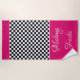 Beach towel with black and white chequered design with fuschia pink that can be switched to any colour of your race team, text can be personalised or text is removable.